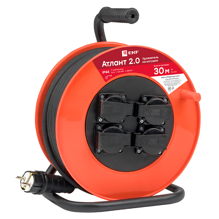 Удлинитель на катушке "Атлант 2.0" 4 гнезда 30м с заземлением КГ 3*1,5 16А/3,5кВт IP44 PROxima EKF