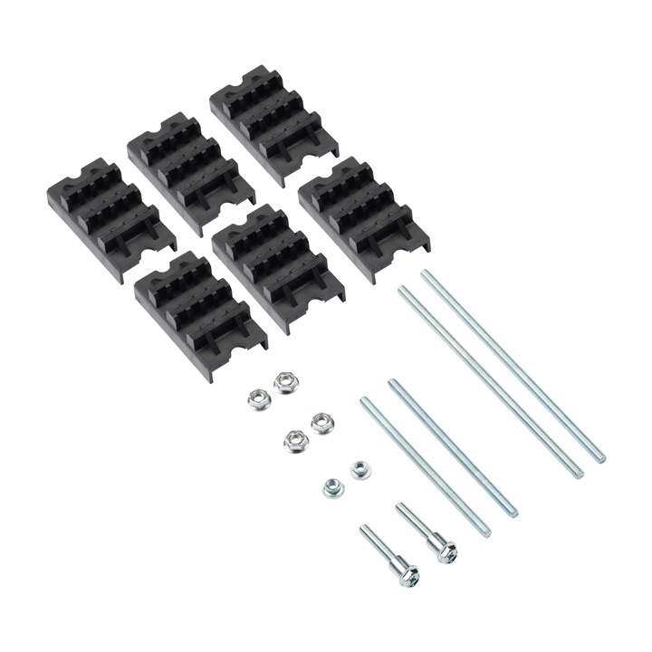 Система наборных шинодержателей позволяет создать требуемую конфигурацию шинодержателя в зависимости от требований проекта. Основанием служит прочный алюминиевый перфорированный профиль, на который насаживаются изоляторы для установки силовых шин ребром. Изоляторы имеют различное исполнение,обеспечивающее возможность установки шин толщиной 5 и 10 мм в количестве от 2-х до 4-х на одну фазу. В составе комплектов идёт необходимый крепёж: гайки, шпильки, винты.