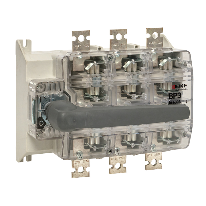 Применяются в качестве аварийного или главного выключателя для токов от 160 до 630 А во вводно-распределительных устройствах, распределительных и шкафах управления и др. Устанавливаются на монтажную панель. Конструктивно ВРЭ EKF PROxima состоит из трехполюсного основания с механизмом замыкания/размыкания контактов и дугогасительными камерами, прозрачной защитной крышки для визуального определения положения контактов и рукоятки. Конструкция контактных выводов обеспечивает болтовое присоединение шин или проводников, оконцованных кабельными наконечниками. Есть возможность установки замка для блокировки включения/отключения.