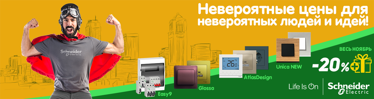 Весь ноябрь предоставляется скидка 20% и полезные подарки* при покупке товаров Schneider Electric из коллекций Glossa, AtlasDesign, Unica New и Easy9.